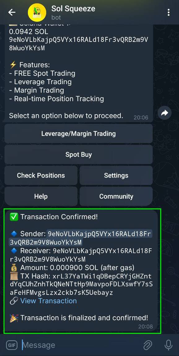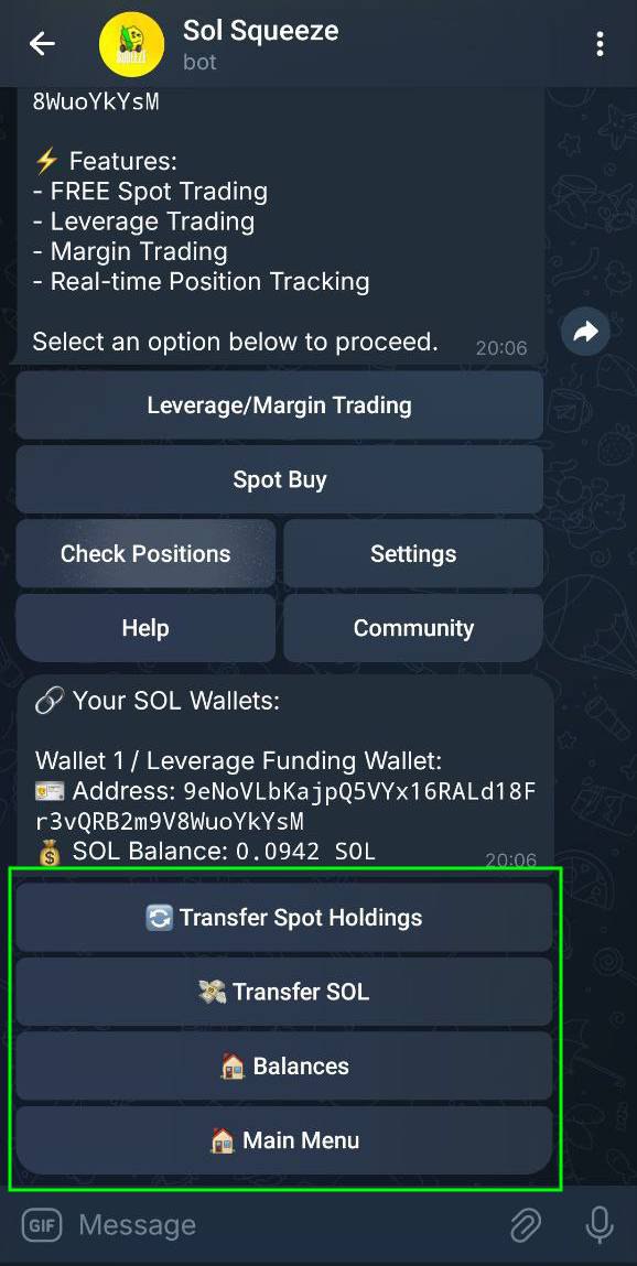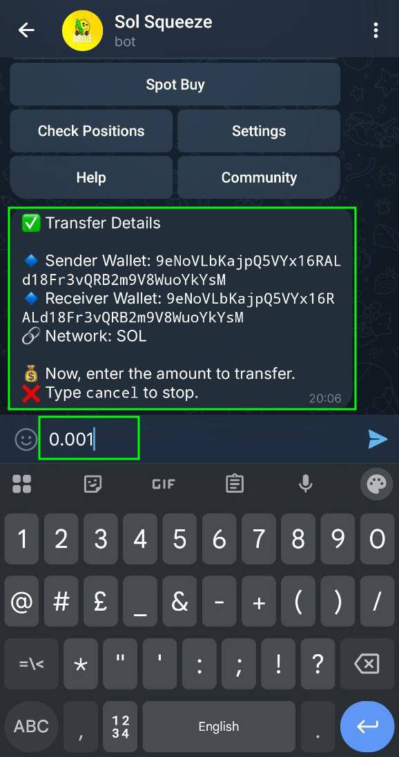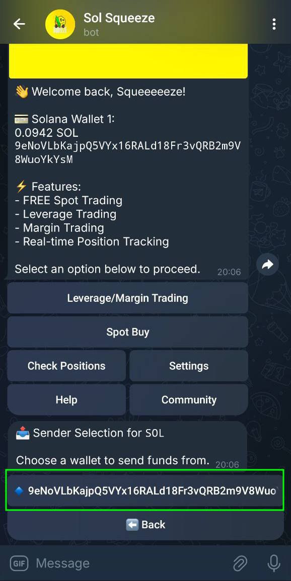 - Copy the bot-generated Solana wallet address from the main screen or type