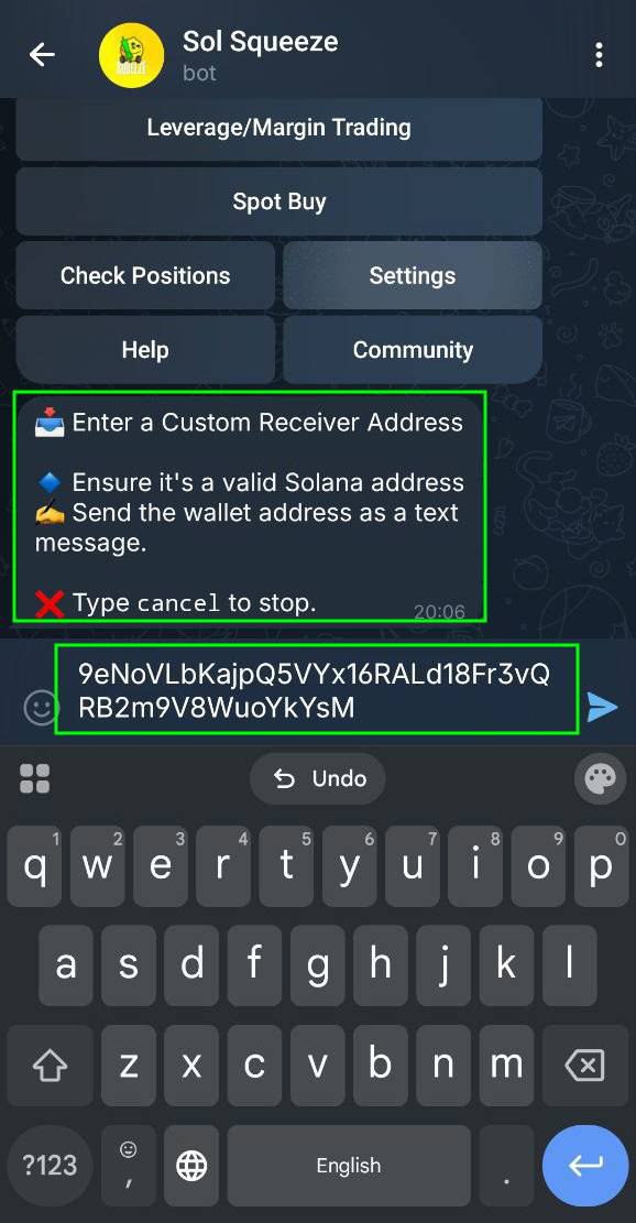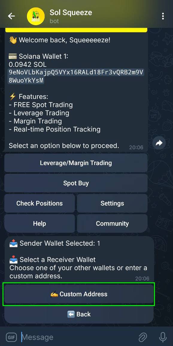 - If you choose Custom Address, type the recipient’s Solana wallet address into the chat.