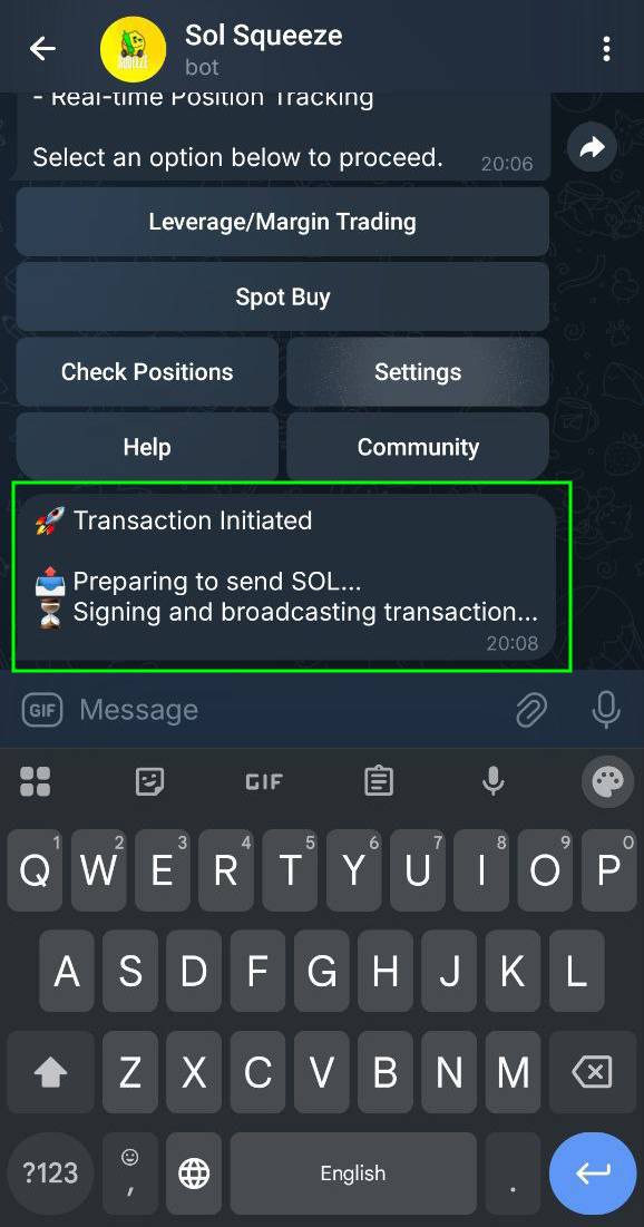 - The bot shows Transaction Initiated while signing and broadcasting.