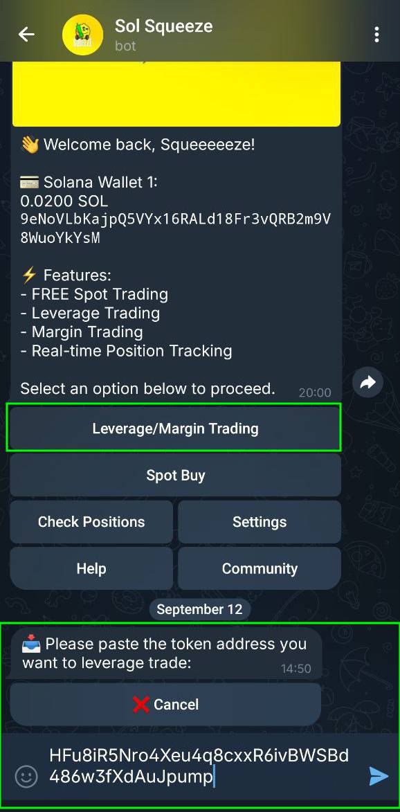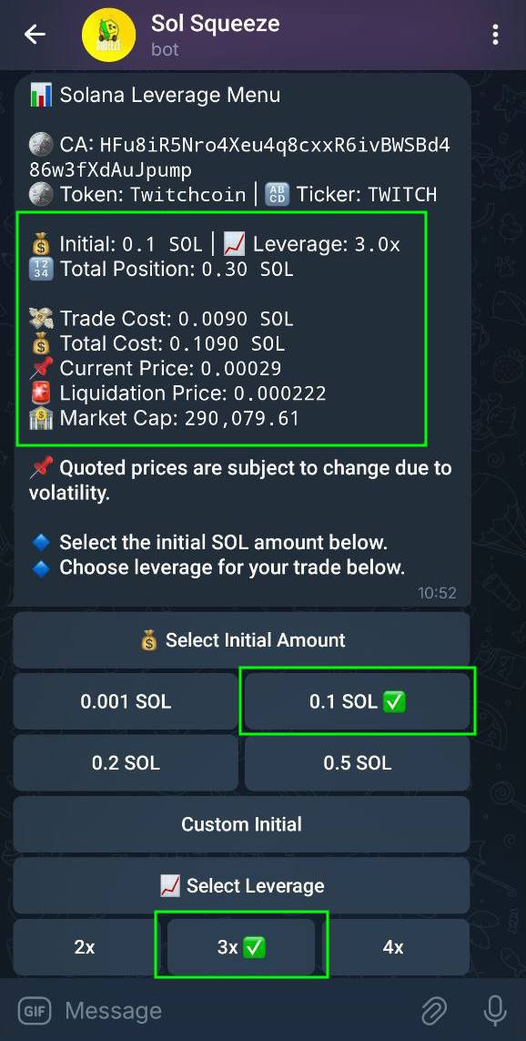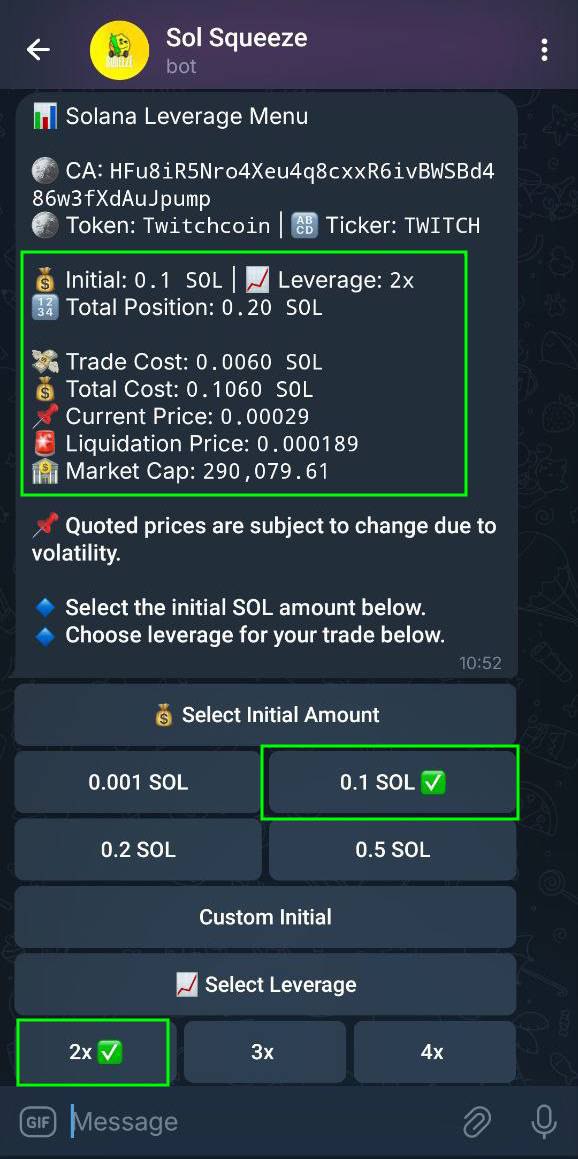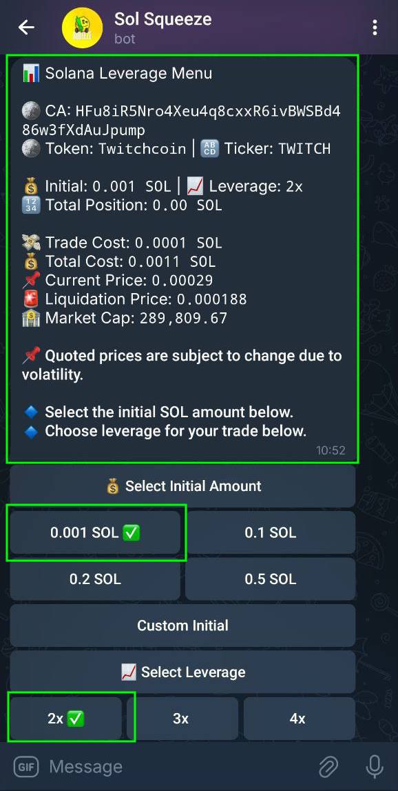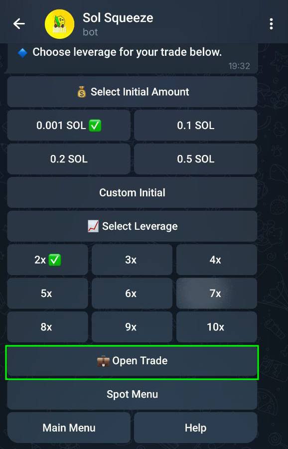 Example: choosing 0.001 SOL with 2x leverage creates a 0.002 SOL position.